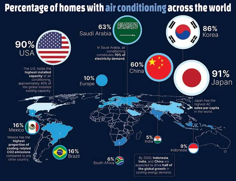 In Japan, the Ministry of Environment recommends that air conditioners be set at 28°C during summer months, especially in offices. The policy is backed by public awareness campaigns and corporate compliance, though it remains advisory in nature.