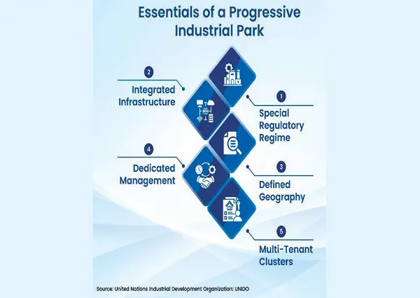 Industrial parks operate under liberal and incentive-based rules for labour, land use, and foreign investment. They offer shared hard and soft facilities such as utilities, telecom networks, waste systems, laboratories, internal roads, one-stop clearances, training centres, security, and emergency services.